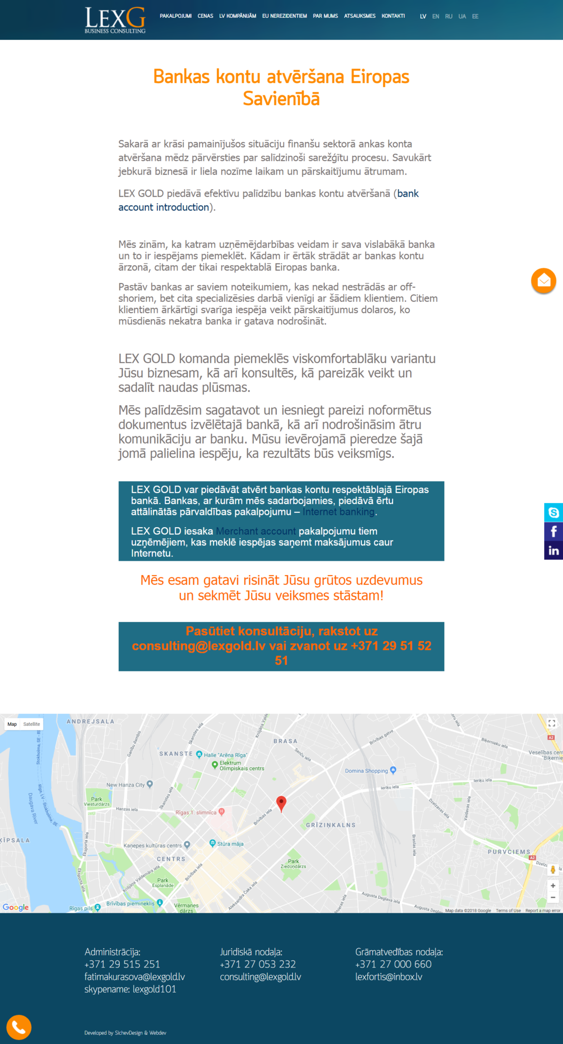 Kompānija LEX GOLD sniedz plašu pakalpojumu spektru juridisko un finanšu konsultāciju jomā. Mēs strādājam gan ar rezidentiem, gan ar nerezidentiem, kuri vēlas paplašināt savu uzņēmējdarbību Eiropas tirgū. Mēs nodrošinām visu komplekso uzdevumu risināšanu. Varat būt droši – par visiem Jūsu jautājumiem parūpēsimies vienā ofisā.